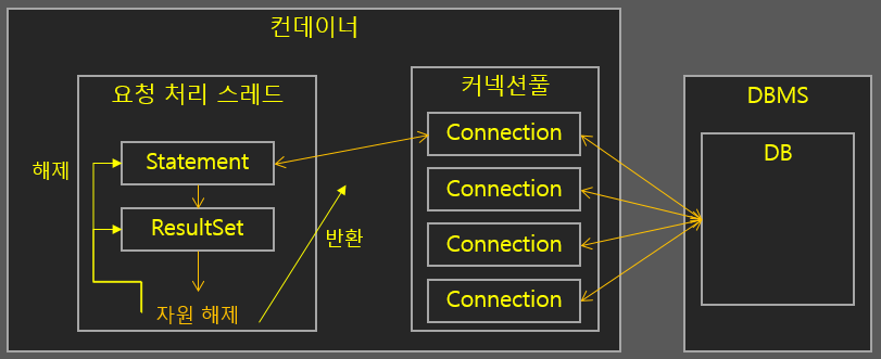 - JDBC API 사용하여 DB와 연결을 위한 Connection 객체 생성작업은 비용이 많이 듦